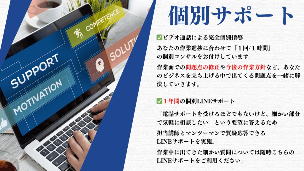 SNS発信・ブログ構築・商品づくり・販売導線までを“完全個別サポート”で一緒に進めます。