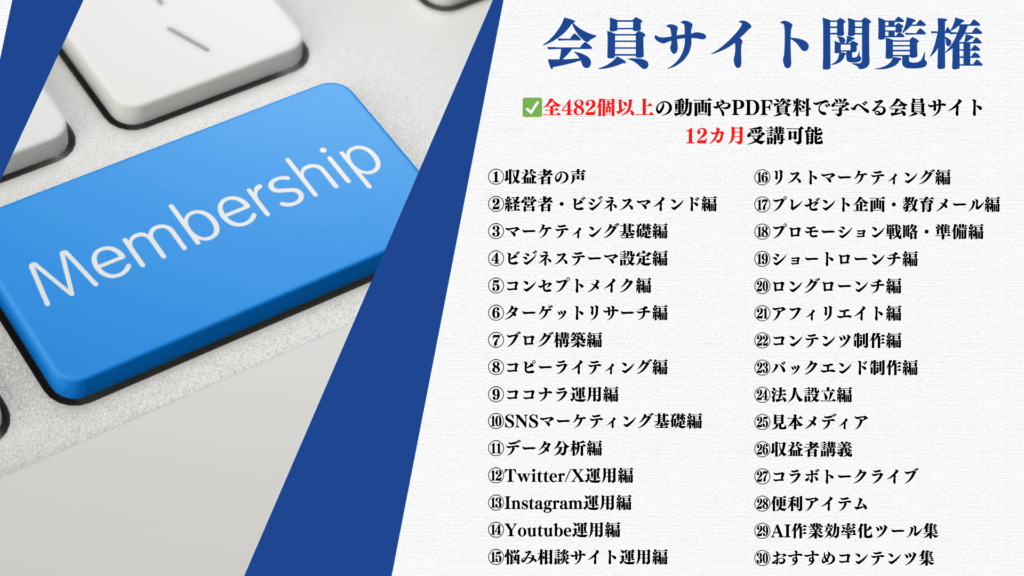 - 482個以上の動画&PDF教材(12ヶ月間閲覧可)