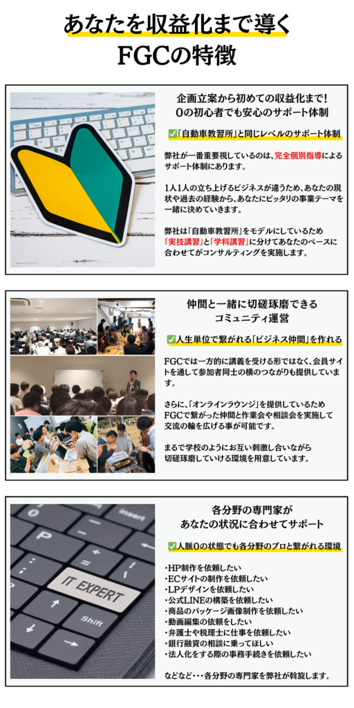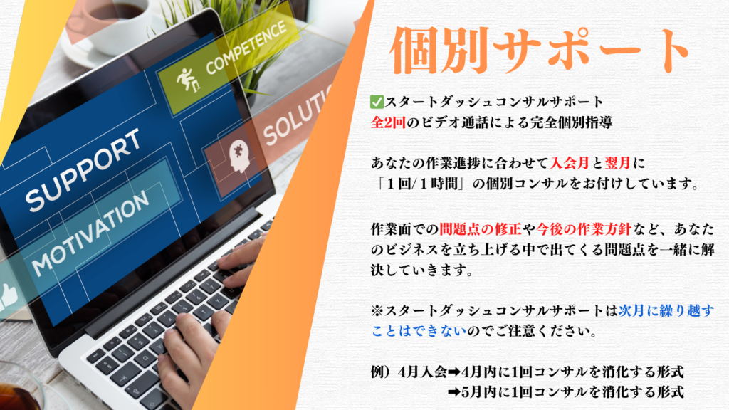 そこで、弊社のオンラインサロンではスタートダッシュコンサルをつけてサポートをさせていただいております。